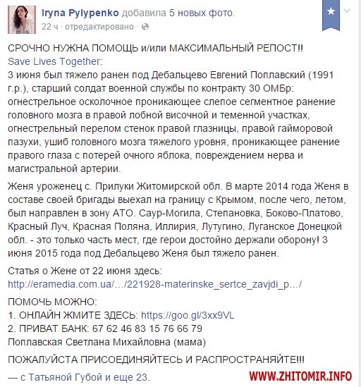 Військовослужбовець 30-ї механізованої бригади, 24-річний Євген Поплавський 3 червня в зоні АТО отримав важке поранення в голову. Нині хлопець перебуває в реанімаційному відділенні Київського шпиталю. Він вже переніс кілька операцій, проте лікарям не вдалося врятувати праве око. Наразі стан бійця залишається тяжким, але рідні сподіваються на одужання: попереду у нього тривале лікування, операції, пластика та реабілітація, тож потрібна допомога небайдужих.