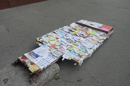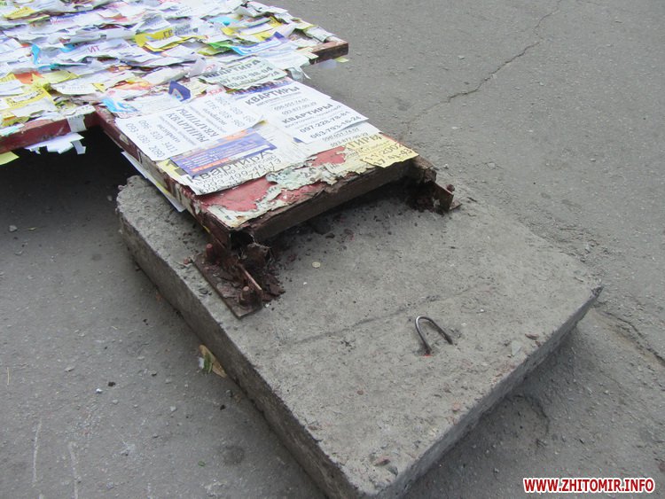 В Житомире на перекрестке улиц Киевская и Восточная, недалеко от остановки троллейбуса, упала металлическая конструкция для бесплатных объявлений.