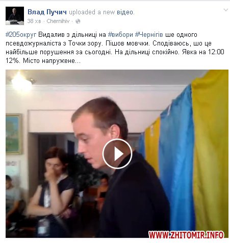 "Видалив з дільниці ше одного псевдожурналіста з Точки зору. Пішов мовчки. Сподіваюсь, що це найбільше порушення за сьогодні. На дільниці спокійно. Явка на 12:00 12%. Місто напружене...», - написав він на своїй сторінці у Facebook.