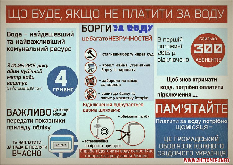 «З 1 по 18 серпня 2015 року розпочнеться відключення від послуг водозабезпечення тих абонентів, які протягом трьох місяців не сплачували за отримані послуги. Критична фінансово-економічна ситуація, у якій знаходиться підприємство, спонукає до радикальних дій щодо боржників, аби болючі проблеми водоканалу не стали болючими проблемами усього міста, а заручниками не стали ті, хто справно платить за воду. Борг населення за спожиті послуги з водозабезпечення становить 19, 2 млн грн», - повідомили на підприємстві.