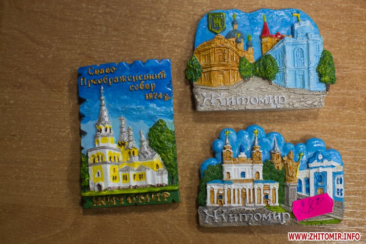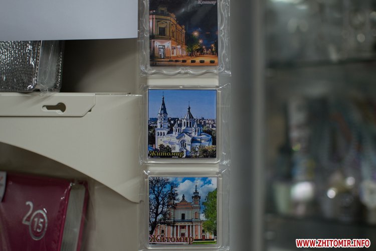 Туристи, зазвичай, крім фотокарток та гарних вражень, полюбляють прихопити на згадку якусь дрібничку: футболку, чашку, листівку чи хоча б магнітик з зображенням гостинного міста. Такі милі дрібнички з зображеннями визначних місць Житомира цікаві не лише туристам, а й житомирянам, які збираються у подорож і бажають, подарувати своїм новим друзям чи знайомим щось на згадку про себе. Чи є у цьому сенсі чим похвалитися Житомиру?