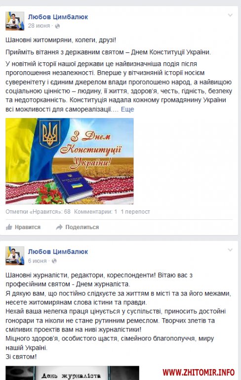 У и.о. мэра 1922 друга на фейсбук и 377 подписчиков страницы. Особой активности Любовь Цимбалюк в соцсети не проявляет: публикуются, в основном, поздравления с праздником, последняя публикация от 28 июня – пожелания к Дню Конституции. Похоже, что Любовь Владимировна лично свою страницу не ведет, но ее облюбовали «тролли» для размещения своих постов.