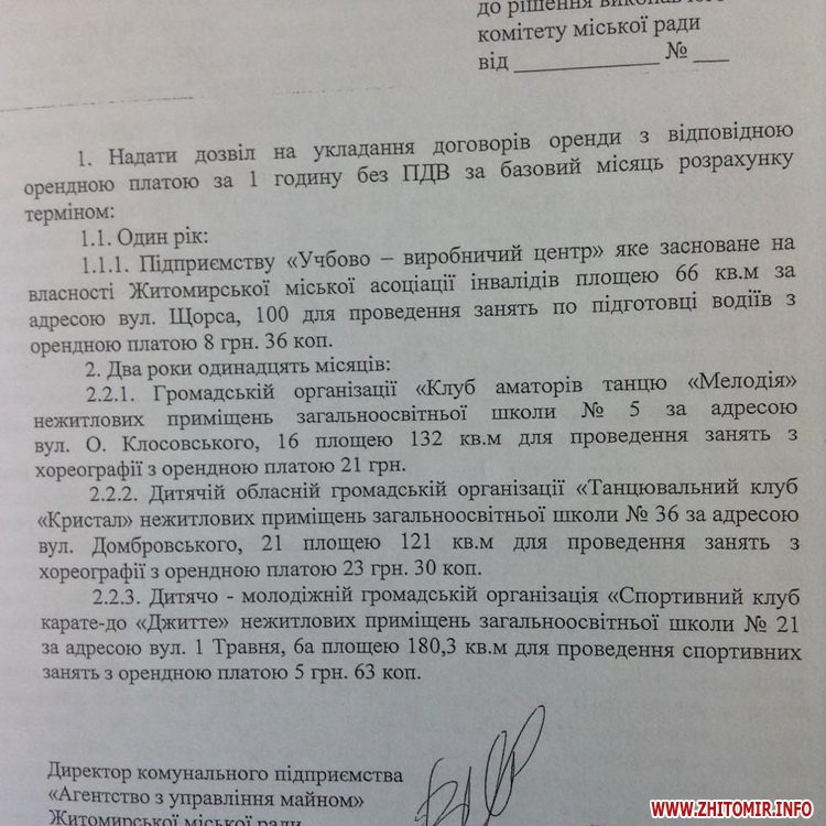 Як повідомляв Житомир.info, проект рішення міськвиконкому, де було питання про оренду клубом «Джитте» нежитлових приміщень загальноосвітньої школи № 21 за адресою вул. 1 Травня, 6а площею 180,3 кв.м для проведення спортивних занять з орендною платою 5 грн 63 коп., був оприлюднений на сайті міської ради ще 23 червня. На засіданні виконкому 5 серпня питання вирішене не було.