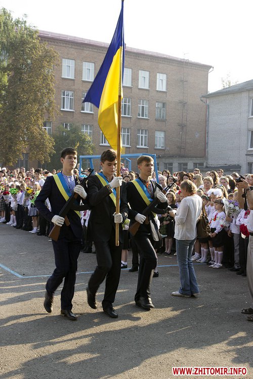 Під час свята школярі старших класів винесли прапор України під супроводженням почасної варти з автоматами.