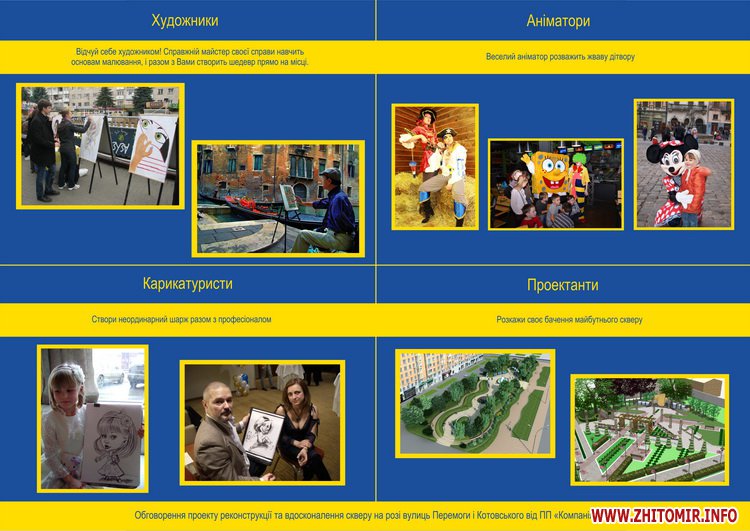 Організатори запрошують житомирян прийти та внести свої пропозиції, правки у проект реконструкції скверу в центрі міста. За це ви отримаєте свій портрет у стилі шарж, та повчитесь малювати фарбами. Найкращі пропозиції будуть нагороджені цінними подарунками.