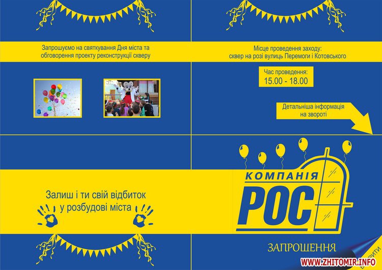 12 вересня з 15.00 до 18.00 ПП «Компанія РОС» запрошує житомирян на мистецький захід “Розбудуємо наше місто разом” у сквері на розі вулиць Перемоги – Котовського, біля Собору, на якому можна буде обговорити та внести свої пропозиції щодо проекту реконструкції скверу.