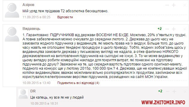 Унизу під публікацією коментатор під ніком «Видавець» повідомляє: чекати підручників доведеться довго, держава досі не замовила у видавництв жодного підручника: