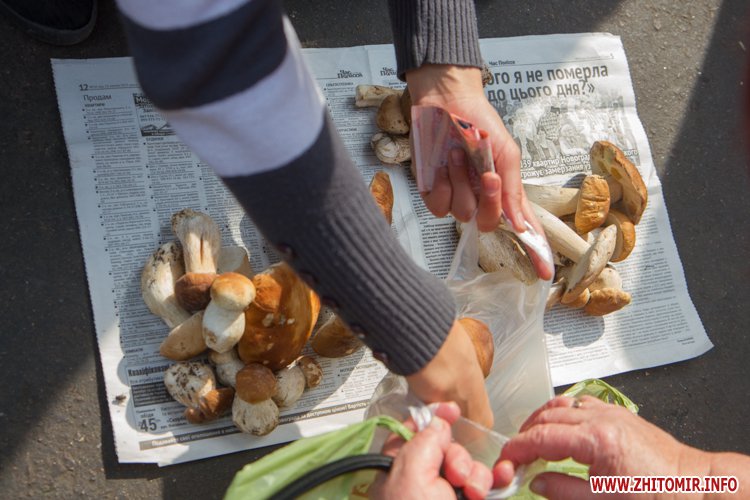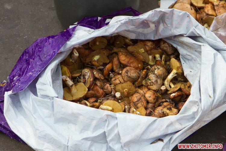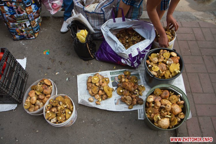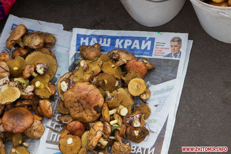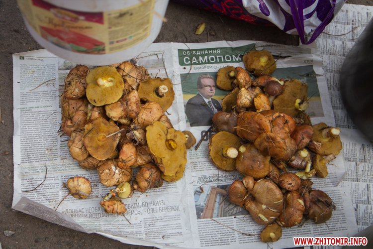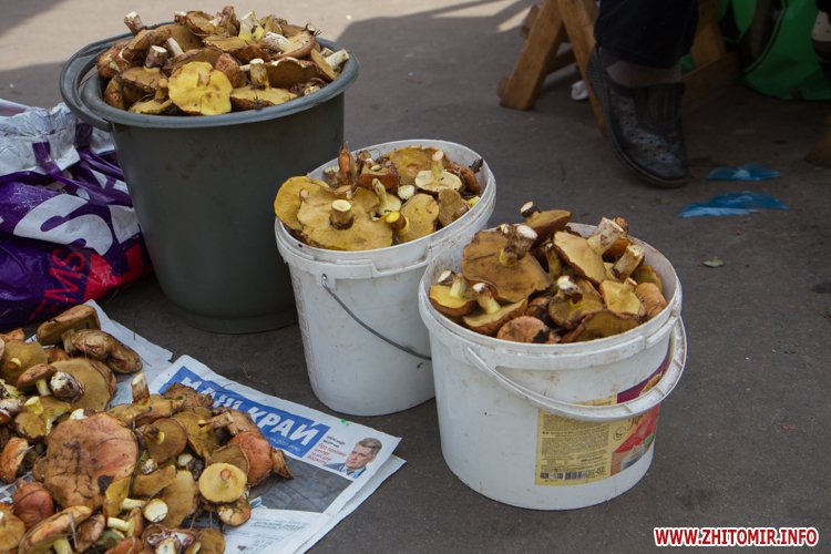 Наразі за невеличку купку маслюків, які привезені з села Іванівка Черняхівського району просять 15 грн, відро на 5 л – 40 грн, 10-ти літрове – 80 грн. За купку краснюків – 20 грн, а білих грибів – 35 грн.