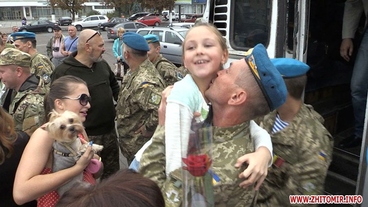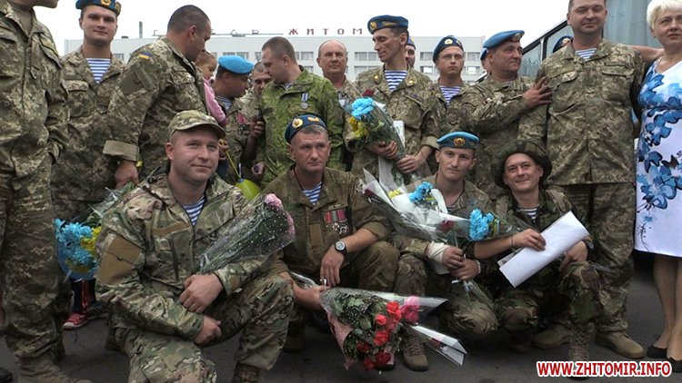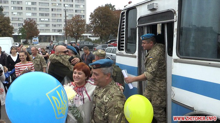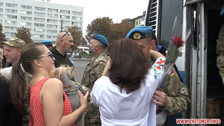 Оплесками, музикою і вигуками «Герої» у Житомирі зустріли демобілізованих бійців 90-го окремого аеромобільного батальйону 81-ї десантної бригади.