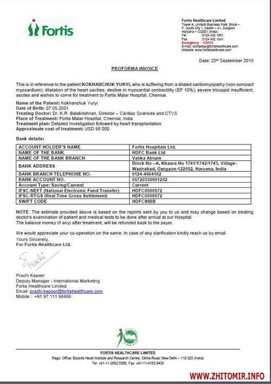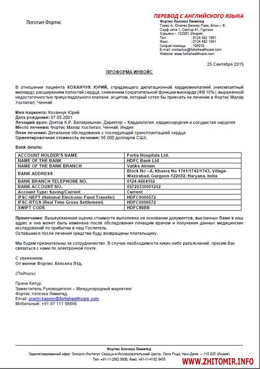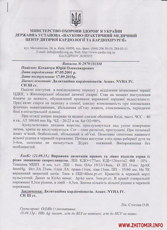 «Нажаль, страшна біда прийшла до нашої сім’ї. Ми благаємо допомогти врятувати життя нашого сина, Коханчука Юрія Олександровича, 07.05.2001 року народження, якому терміново потрібна трансплантація серця. 22 вересня лікарями «Науково-практичного медичного центру дитячої кардіології та кардіохірургії» було встановлено страшний діагноз Юрка - некомпактний міокардит, який не піддається лікуванню, потрібна тільки операція. В Україні такі операції не проводять, тому шанс врятувати життя Юрка ми маємо лише за кордоном. Але така операція дуже дорога, і коштує від 100 000,00 до 140 000.00 доларів США. Така величезна сума є не підйомною для нашої сім’ї, тому звертаємось до всіх з проханням про допомогу. Часу для того, щоб зібрати кошти, нестерпно мало!!! Благаємо всіх про допомогу», – скзав Олександр Коханчук.