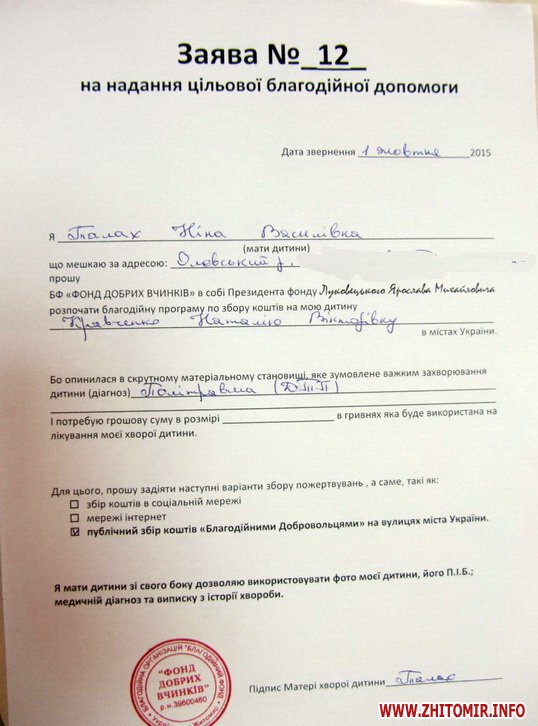 Чоловік розповідає: «Фонд добрих вчинків» був заснований в Житомирі на початку 2015 року. За неповний рік волонтерами зібрано і передано на лікування дітей більш як 51 тис. грн.