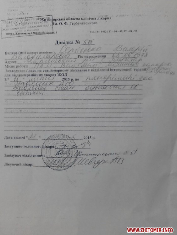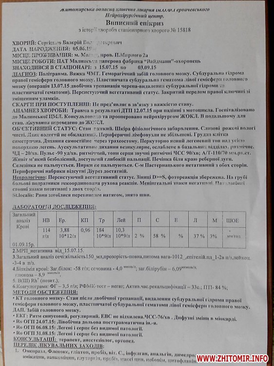 «Демобілізували його в березні. В зоні АТО захищав Слов’янськ, Карачун, Степанівку, Лисичанськ. 12 липня він їхав мотоциклом у справах на село і на виїзді з Малина врізався в машину, яка повертала і не включила поворот. За весь цей час ці люди не подзвонили, не поцікавились і нічим не допомогли сім’ї. Його прооперували в обласній лікарні, і терміново потрібно на реабілітацію, а коштів немає. Дружина щодня з Малина їздить до нього в Житомир і в них вдома маленька дитина», – розповіла волонтерка.