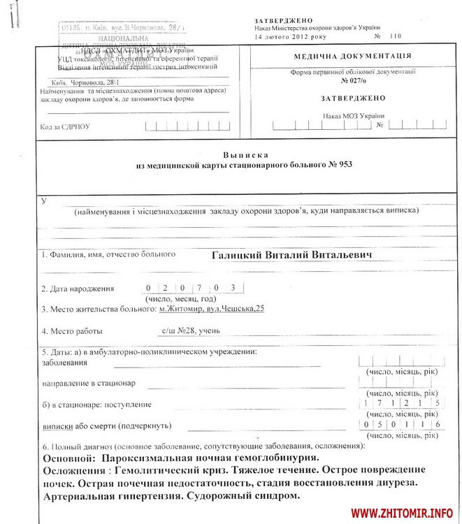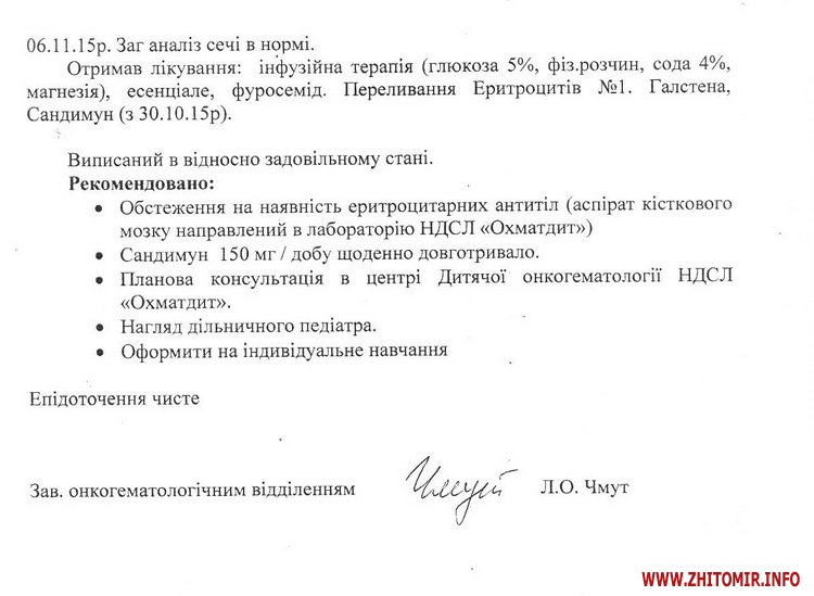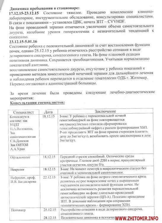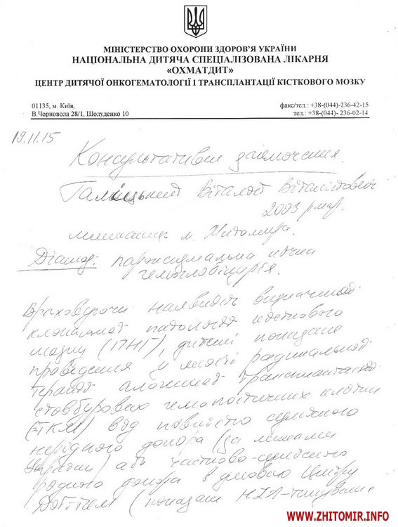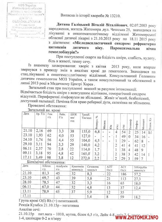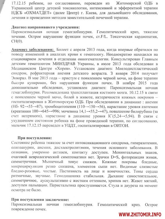 «У квітні 2013 року у Віталія виявили погані аналізи крові, ми одразу звернулись до гематолога. Довготривале обстеження не давало певних результатів, точного діагнозу не могли встановити ні лікарі Житомирської обласної дитячої лікарні, ні лікарі медичного центру Хорев (Ізраїль). Довготривале лікування також не приносило результатів. Стан дитини постійно погіршувався. Лише в листопаді 2015 року нам поставили невтішний діагноз: Нічна пароксизмальна гемоглобінурія. Ускладнення: Гемолітичний криз, гостре ушкодження нирок. Лише пересадка кісткового мозку від нерідного донора може врятувати життя мого сина», - розповіла Олена.