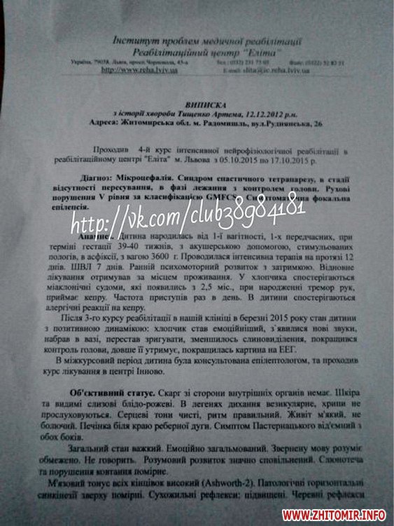 «Мій син Тищенко Артем Борисович народився в Радомишлі 12.12.12 р. Вагітність проходила чудово, токсикозу не було, на збереженні не перебувала. Але в день пологів мені запропонували половину таблетки, щоб швидше народити. Пологи були партнерські, але коли наш синок народився, він не дихав хвилин 8. Кисневої подушки не було, шукали по всій лікарні. Стан дитини оцінили у 2 бали по шкалі Апгар, у нього був тремор. Через 5 годин нас забрали у реанімацію в Станишівку та підключили до апарату штучної вентиляції легень. На даний момент синочку 3 рочки, він не сидить, не ходить , трапляються судоми, які дуже пригнічують розвиток. Незважаючи на це, Артем пройшов 4 курси реабілітації в центрі професора Козявкіна «Еліта» та 6 курсів реабілітації в центрі «Інново», обидва у Львові. Наш діагноз на даний момент: «Пошкодження ЦНС, затримка всіх видів розвитку, мікроцефалія, судомний синдром, спастичний тетрапарез». Прошу всіх добрих людей допомогти нам поїхати на таку потрібну нам реабілітацію», - написала Анна.