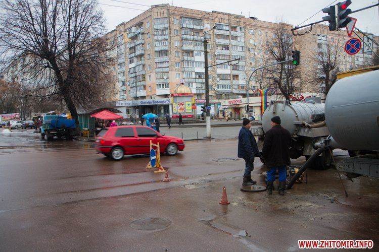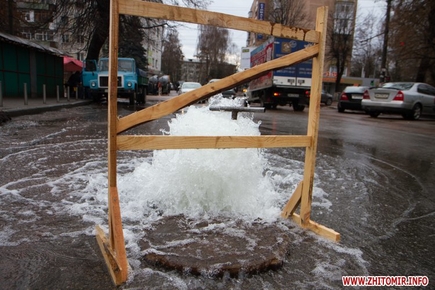 У Житомирі 11 лютого близько 15.00 на вулиці Довженка з-під каналізаційного люку на дорозі почав бити фонтан.