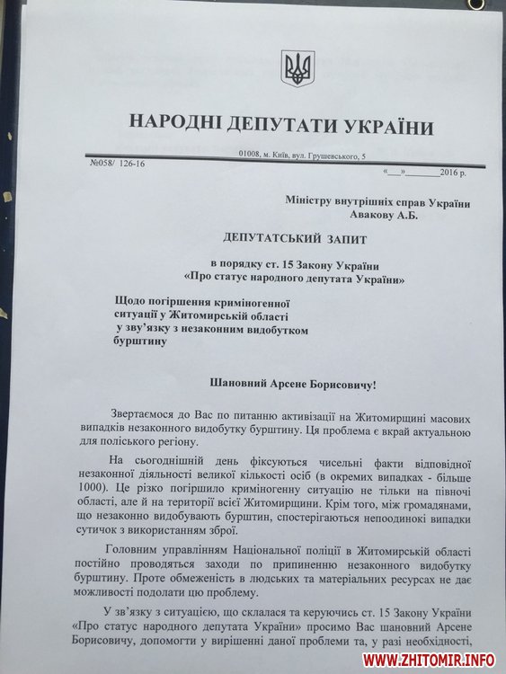 У листі йде мова про те, що у Житомирській області погіршується криміногенна ситуація у зв’язку з незаконним видобутком бурштину. Відповідно, така ситуація впливає не тільки на північну частину регіону, але й на усю територію Житомирщини.
