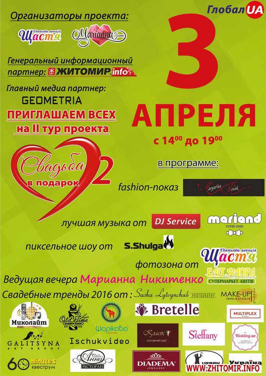 Дорогие друзья! Уже в это воскресенье – 3 апреля в 14.00 в ТРЦ «Глобал.UA» - стартует второй тур грандиозного проекта «Свадьба в подарок 2»!!!