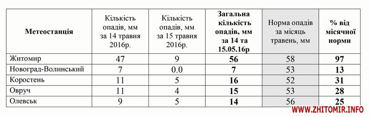 Загалом впродовж 14-15 травня у м. Житомирі сума опадів склала 56 мм, що майже досягло їх місячної норми.