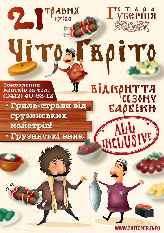 21 травня о 17:00 - ми разом з кухарями з Тбілісі відкриваємо сезон барбекю В СТАРІЙ ГУБЕРНІЇ. Хто ж краще, ніж грузини приготує м'ясо на вугіллі? Три години поспіль вам будуть виносити гриль страви від грузинських майстрів і розливати грузинські вина, адже – ALL INCLUSIVE! Ви спробуєте все, чим наша гриль кухня буде радувати вас все літо! Розважальна програма, шикарний музичний супровід, дискотека. Ну, ви самі знаєте - в Губернії це робити вміють класно!)))