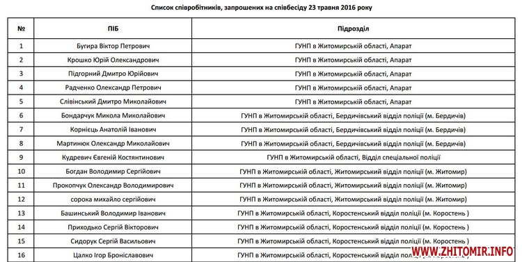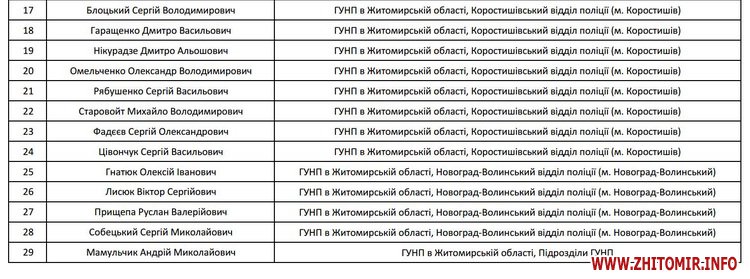 Список співробітників опублікований на сайті ГУ Нацполіції у Житомирській області.
