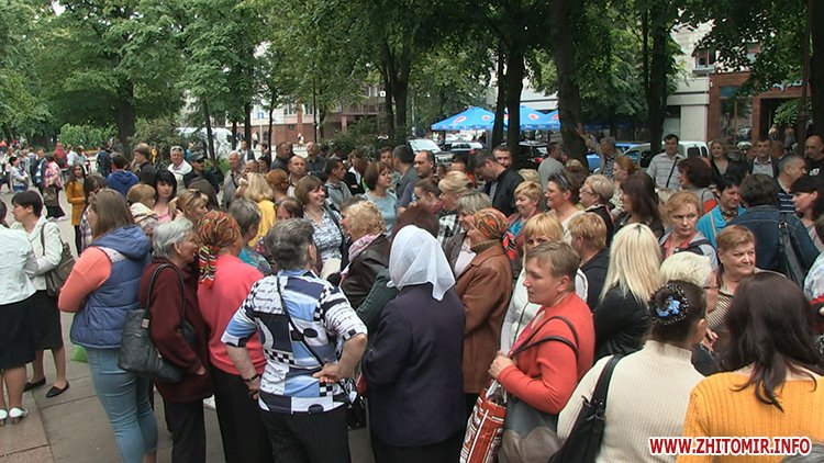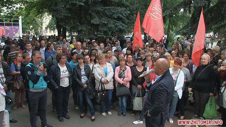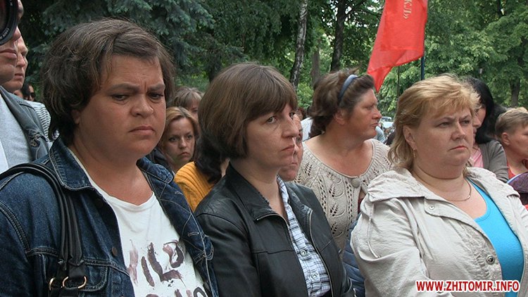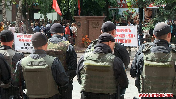 Біля Житомирського обласного управління Національної поліції - кордон правоохоронців, навпроти них - працівники кондитерської фабрики. Співробітники Товариства з додатковою відповідальністю «ЖЛ», які залишилися без роботи і не можуть потрапити на робочі місця, прийшли до нового начальника поліції за допомогою.