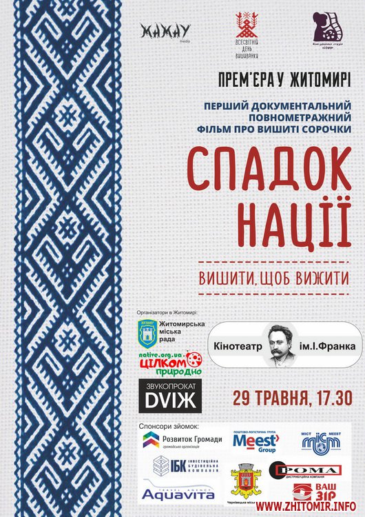 У Житомирі 29 травня у приміщенні кінотеатру ім. Івана Франка о 17:30 відбудеться прем’єрний показ першого повнометражного документально фільму про вишиті сорочки «Спадок Нації».