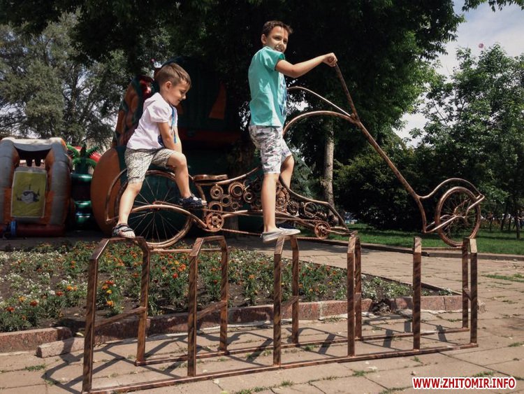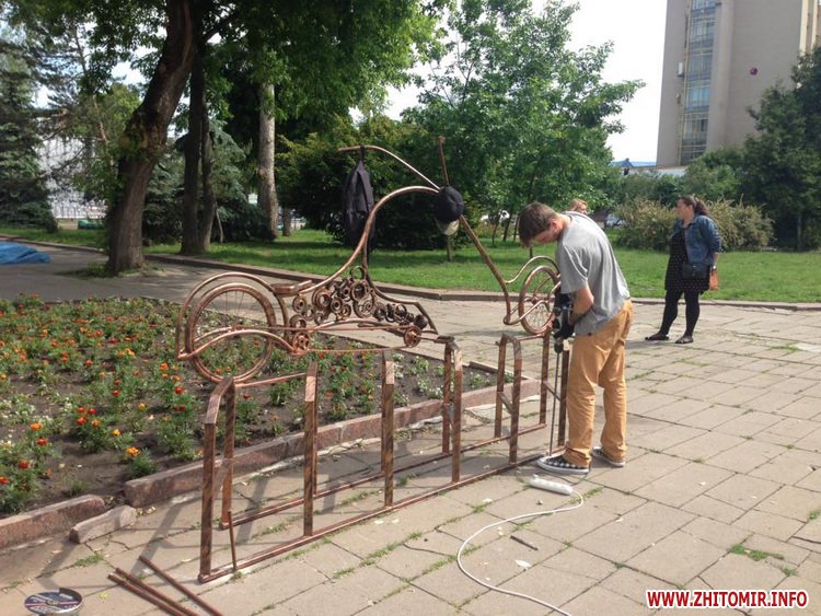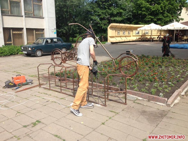 У центрі Житомира, біля обласної бібліотеки ім. Ольжича, 27 травня команда вуличного художника Дмитра Краба встановила металеву велопарковку у вигляді ретро-велосипеда.