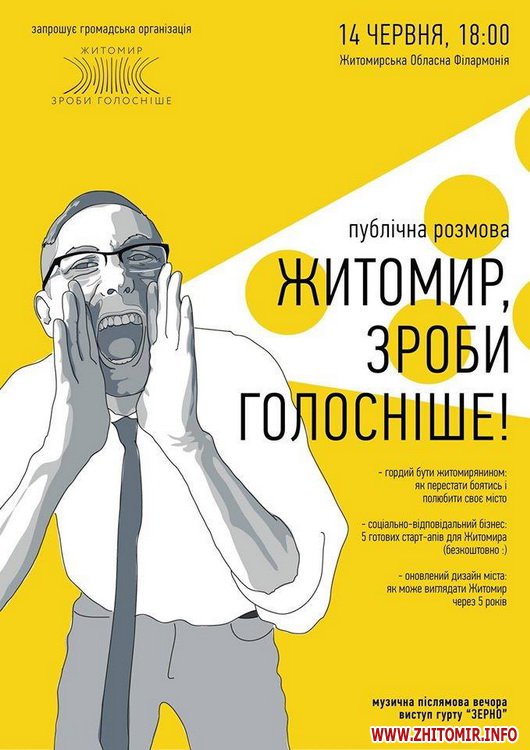 Житомирян запрошують 14 червня о 18.00 год. на публічну розмову «Житомир, зроби голосніше!», що відбудеться в обласній філармонії.