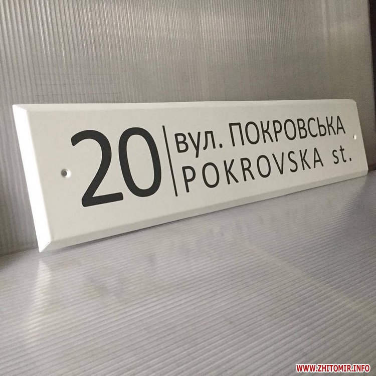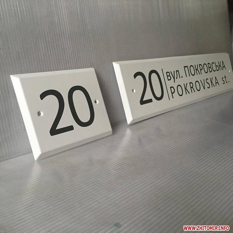 У Житомирі розробили декілька варіантів дизайну адресних табличок з новими назвами перейменованих вулиць. Остаточне рішення прийматиме земельна комісія на засіданні 14 червня.