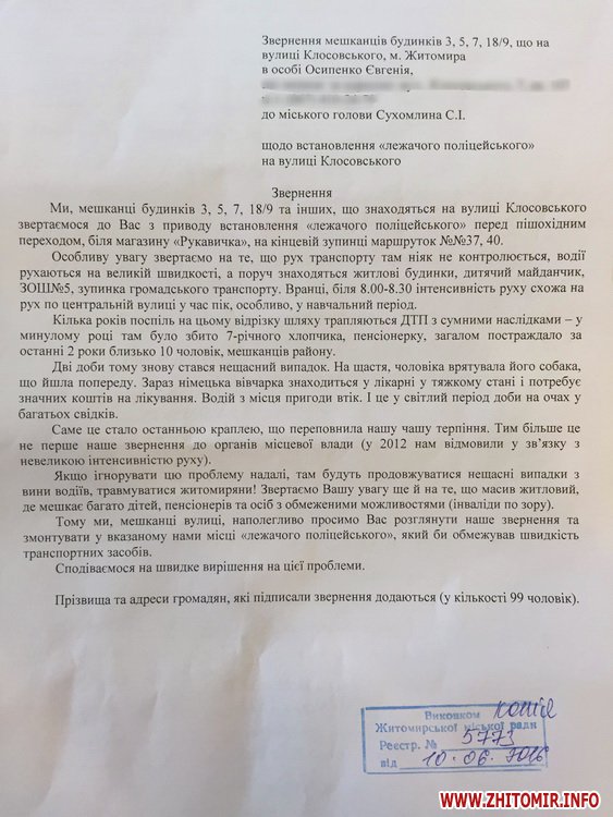 «Ми, мешканці будинків 3, 5, 7, 18/9 та інших, що знаходяться на вулиці Клосовського звертаємося до Вас з приводу встановлення «лежачого поліцейського» перед пішохідним переходом, біля магазину «Рукавичка», на кінцевій зупинці маршруток №№37, 40. Особливу увагу звертаємо на те, що рух транспорту там ніяк не контролюється, водії рухаються на великій швидкості, а поруч знаходяться житлові будинки, дитячий майданчик, ЗОШ№5, зупинка громадського транспорту. Вранці, біля 8.00-8.30 інтенсивність руху схожа на рух по центральній вулиці у час пік, особливо, у навчальний період.