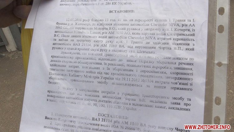 Після аварії 11 травня автомобіль Василя Чортка ремонту вже не підлягає. Після ДТП його автівку доставили на спецмайданчик у якості речового доказу і 7 червня мали повернути. Постанову про безоплатне повернення автомобілю підписав слідчий Житомирського відділу поліції, але охоронець спецмайданчику видав йому інший документ - рахунок до сплати.