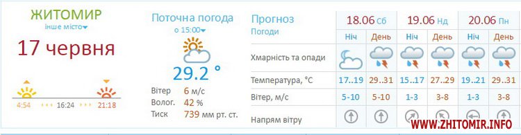 Так, в суботу, 18 червня, у місті очікується спекотна (+29…31) вітряна погода, можливі грозові дощі. Подібна погода очікується 19 та 20 червня: спека, опади, вітер послабшає.