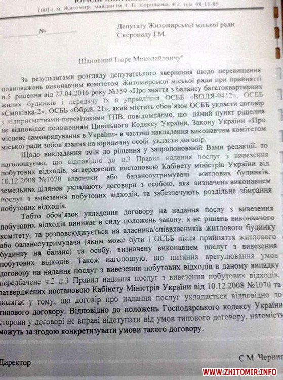Зі слів голови асоціації ОСББ «Жито-Мир» Ігоря Скоропада, існує закон, в якому сказано, що вивіз твердих відходів - це окрема послуга, і це не може бути колективний договір.
