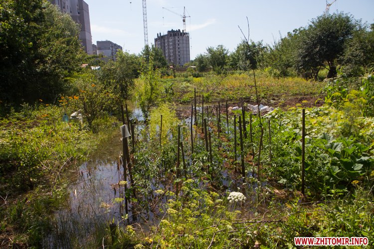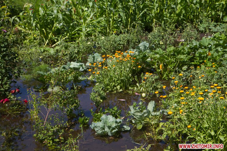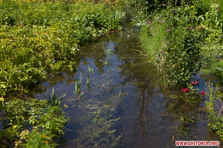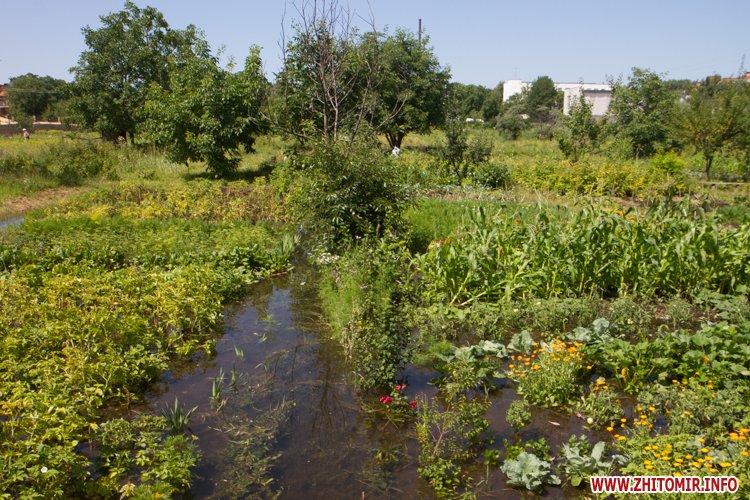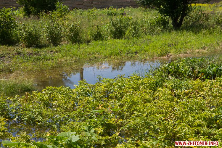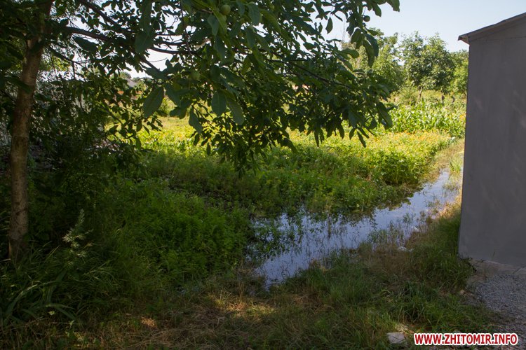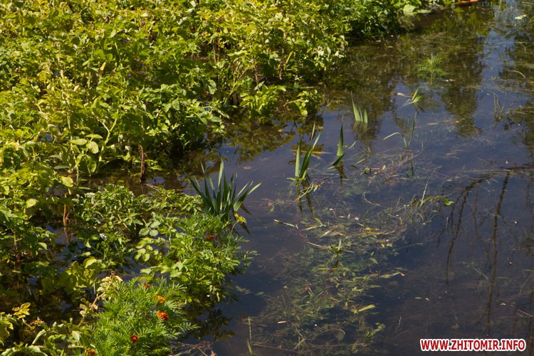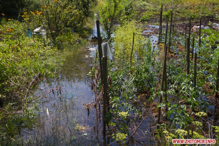 У Житомирі по вулиці Народицькій, 21 з 8 липня вода, яка ллється з-під землі, затоплює город місцевих мешканців. Люди очікують приїзду працівників водоканалу.