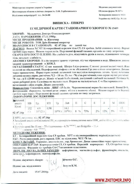 ДІАГНОЗ: важка хребетно-спино-мозкова травма. Перелом С5, С6 хребців. Верхній грубий парапез. Нижня параплегія. Тазові порушення по типу затримки.