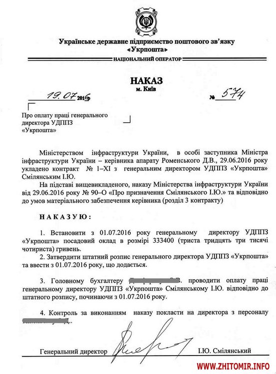 Через три тижні своєї роботи генеральний директор УДППЗ «Укрпошта» Ігор Смілянський наказав виплатити собі зарплату 333400 грн і вже отримав на руки аванс.