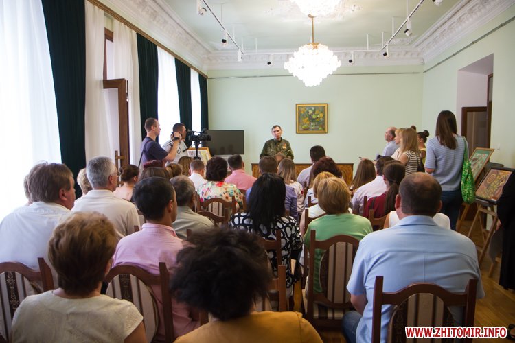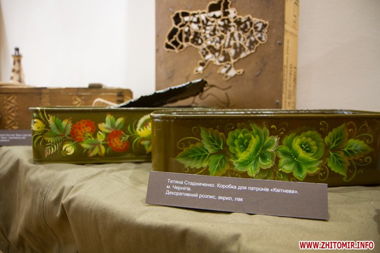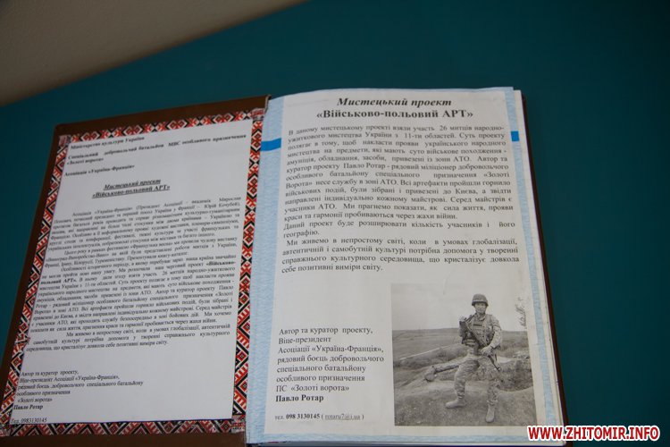 Мистецький проект «Військово-польовий арт» стартував 11 серпня у Житомирі в «Домі Української культури». Організатори розповіли, що це друге місто, в якому проводять виставку у рамках всеукраїнського туру.
