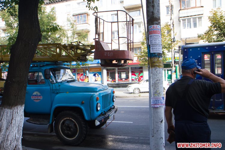 Фотокореспондент Житомир.info побачив комунальників «Міськсвітла» близько 9.15 на перехресті вулиць Київська-Небесна сотня. Працівники вирішили повернутися на місце пізніше, адже не взяли з собою знаряддя.