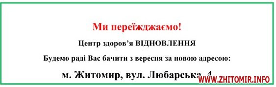 Сьогодні наш персонал професійно зростає, а масштаби центру впевнено набирають обертів шляхом збільшення кількості напрямків роботи, лікувальних апаратів. У зв’язку з такими змінами ми раді сповістити новину про те, що ми переїжджаємо до нового приміщення за адресою: м. Житомир, вул. Любарська 4.