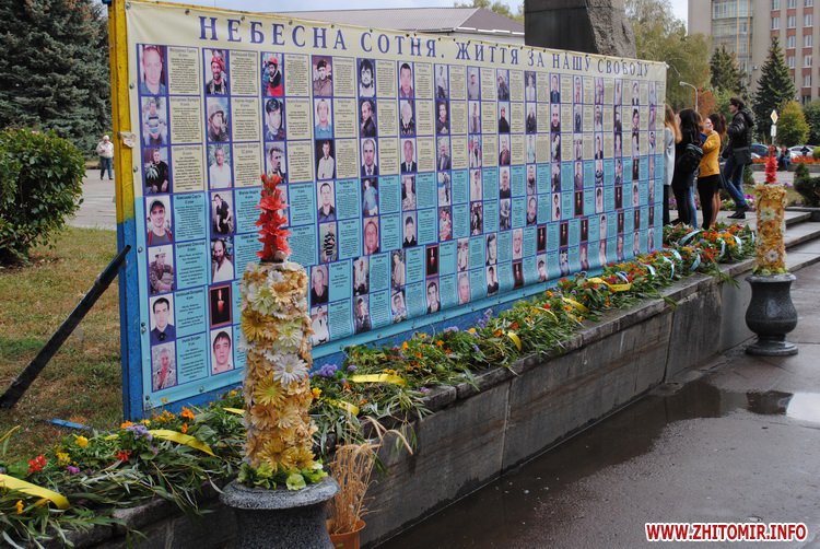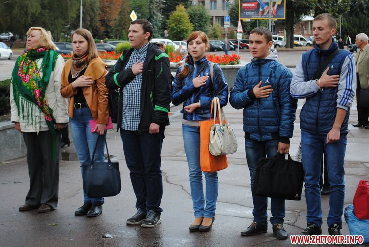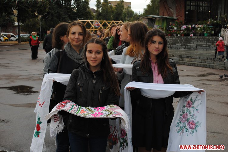 З вишитих українських рушників студенти ЖДУ ім. І. Франка поблизу стели Небесної Сотні зробили слово «Мир», а школярі після виконання спільно гімну України разом з волонтерами ініціативної групи «Об’єднання Самопоміч» запустили у небо голубів.
