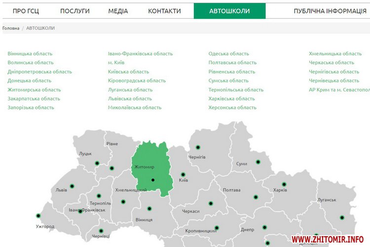 На мапі нанесені автошколи, які розташовані в 41 населеному пункті Житомирської області. Щоб переглянути адреси та контакти, на мапі потрібно натиснути «Житомир».