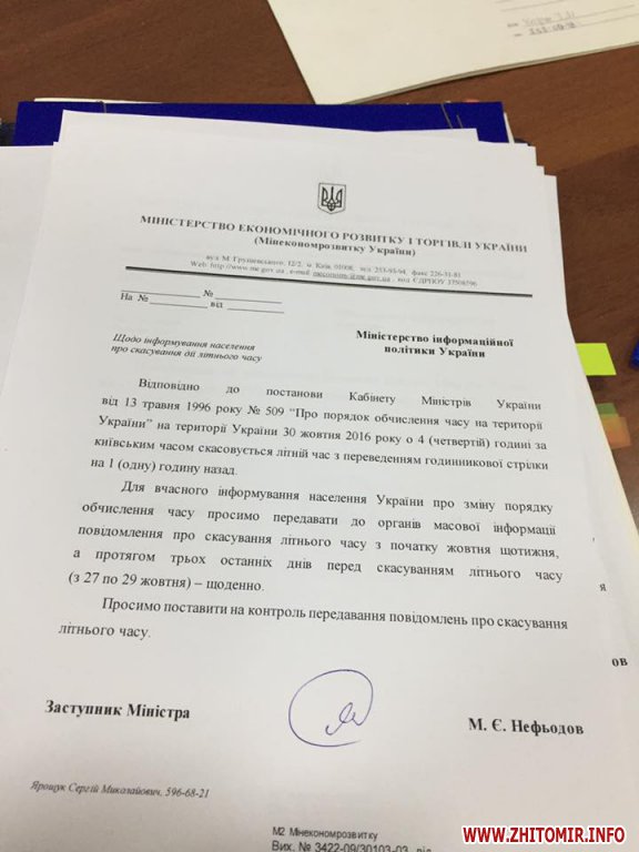 «Відповідно до постанови Кабінету Міністрів України від 13 травня 1996 року №509 «про порядок обчислення часу на території України» на території України 30 жовтня 2016 року о 4 (четвертій) годині за київським часом скасовується літній час з переведенням годинникової стрілки на 1 (одну) годину назад», - йдеться у листі, який був направлений на адресу Мінінформполітики для вчасного інформування населення.