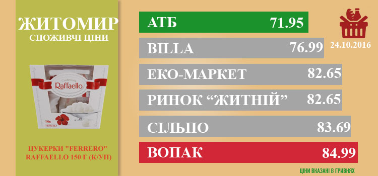 АТБ, пр. Миру, 15 А, Ринок "Житній", майдан Житній ринок, Billa, пр. Миру, 15,Сільпо, майдан Житній ринок, 1, ЕКО-маркет, вул. Мала Бердичівська, 2/7,Вопак, вул. Київська, 87.