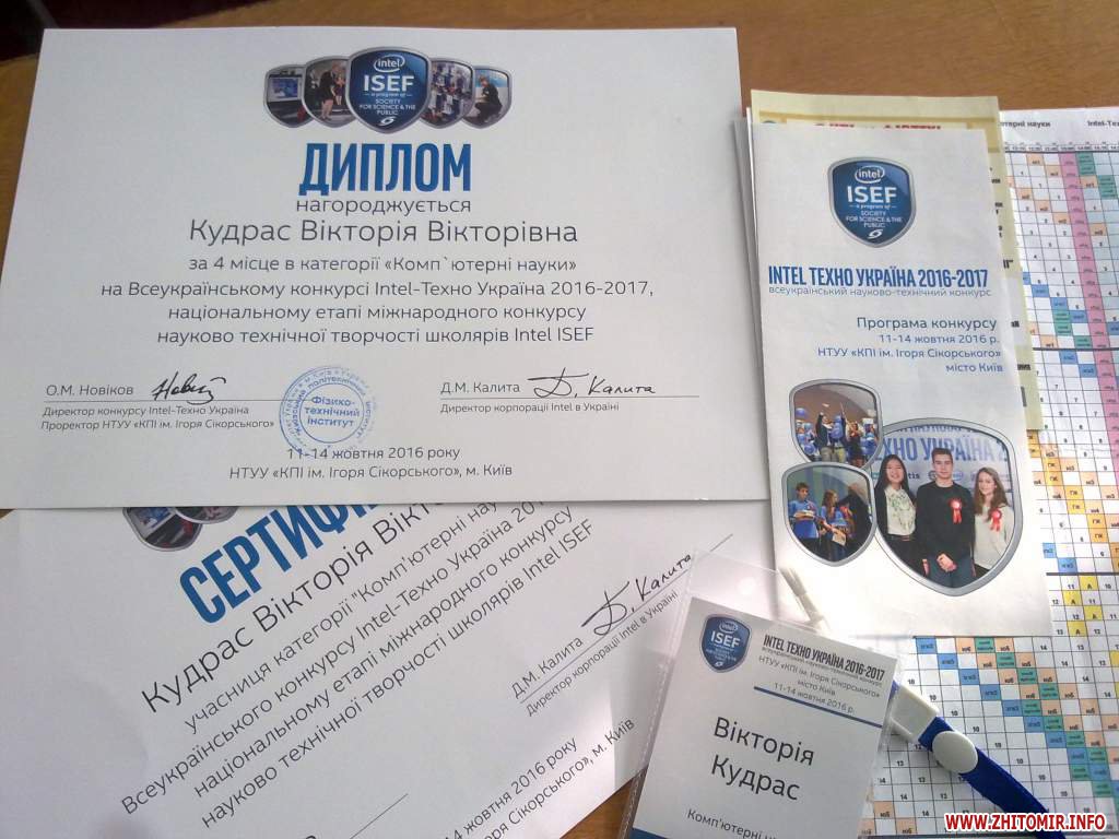 «У межах Фестивалю інноваційних проектів «Sikorsky Challenge» відбувався 8-й конкурс для учнів загальноосвітніх навчальних закладів України «Intel-Технo Україна 2016-2017» – національний етап міжнародного конкурсу науково-технічної творчості школярів Intel ISEF (International Science and Engineering Fair). Учениця 11-го класу Житомирської загальноосвітньої школи І-ІІІ ступенів №17 Кудрас Вікторія під керівництвом учителя інформатики Тарасюка Миколи Дмитровича посіла призове 4 місце в категорії «Комп'ютерні науки» та нагороджена спеціальним призом від благодійної організації «Відкриті серця», - інформує міська рада.