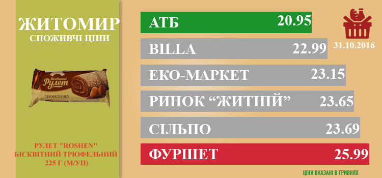 АТБ, пр. Миру, 15 А, Ринок "Житній", майдан Житній ринок, Billa, пр. Миру, 15, ЕКО-маркет, вул. Мала Бердичівська, 2/7,Сільпо, майдан Житній ринок, 1, Фуршет, вул. Вітрука, 9 а.