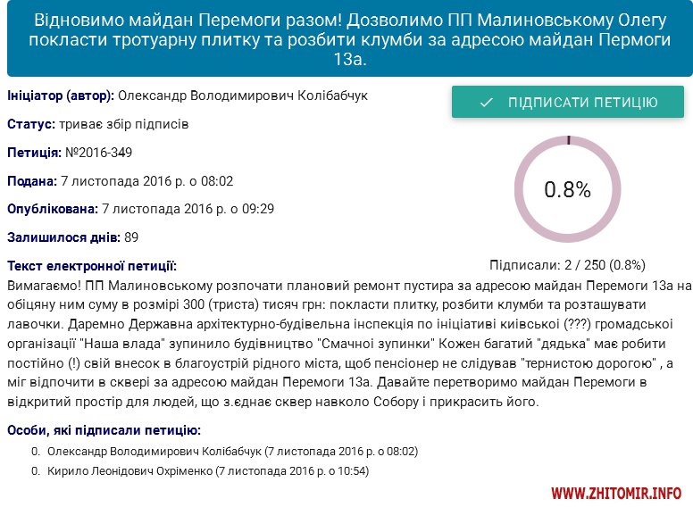 «Вимагаємо! ПП Малиновському розпочати плановий ремонт пустира за адресою майдан Перемоги 13а на обіцяну ним суму в розмірі 300 (триста) тисяч грн: покласти плитку, розбити клумби та розташувати лавочки. Даремно Державна архітектурно-будівельна інспекція по ініціативі київської (???) громадської організації "Наша влада" зупинило будівництво "Смачної зупинки" Кожен багатий "дядька" має робити постійно (!) свій внесок в благоустрій рідного міста, щоб пенсіонер не слідував "тернистою дорогою" , а міг відпочити в сквері за адресою майдан Перемоги 13а. Давайте перетворимо майдан Перемоги в відкритий простір для людей, що з’єднає сквер навколо Собору і прикрасить його», - закликає автор петиції.