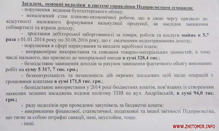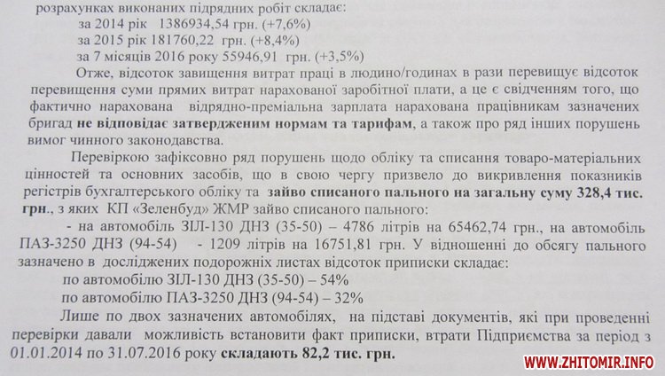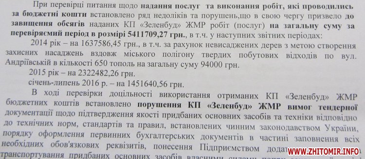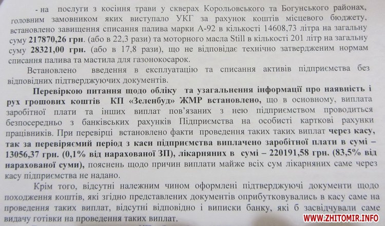 Перевірка діяльності КП «Зеленбуд» з 1 січня 2014 року по 31 липня 2016 року виявила значні порушення, в тому числі – приписки обсягів виконаних робіт, списання пального, отримання коштів головним бухгалтером за допомогою корпоративної картки, висадження «невидимих» дерев та багато іншого – про це Житомир.info розповів мер Житомира Сергій Сухомлин.