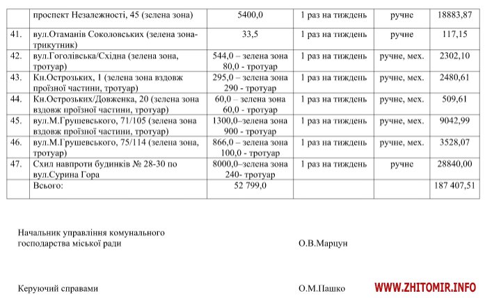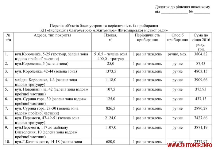 У додатку є перелік з 47 адрес, більшість з яких – зелені зони вздовж проїзної частини чи тротуарів. Загальна площа об’єктів, які буде прибирати КП «Інспекція з благоустрою м.Житомира» - 52 тис. 799 кв.м. Кожен об’єкт прибиратиметься раз на тиждень, у більшості спосіб прибирання «ручне». Сума виконання робіт до кінця 2016 року – 187 тис. 407,15 грн.