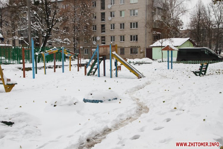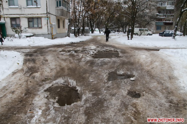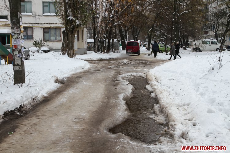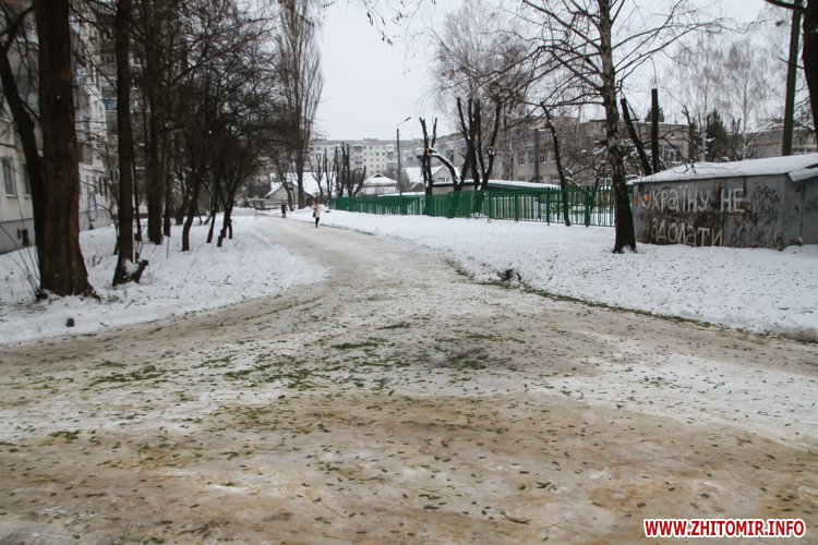 В мікрорайоні Крошня більшість доріг у дворах схожі на бугристі ковзанки, подекуди посипані піском. Вчорашня плюсова температура давала можливість розчистити тротуари та придомові проїзди від снігу, але вочевидь, комунальники цим не скористалися і ранковий мороз «зацементував» підталі кучугури. Припускаємо, що Крошня - не виняток, і така ситуації у більшості дворів житомирських багатоповерхівок.
