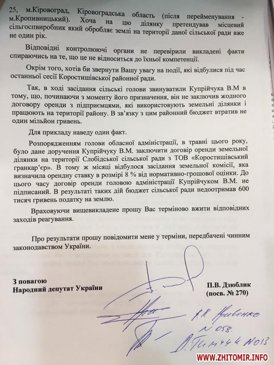 Розпорядженням голови обласної адміністрації, в травні цього року, було дане доручення Купрійчуку В. М. заключити договір оренди земельної ділянки Слобідської сільської ради з ТОВ «Коростишівський гарнкар’єр». В тому ж місяці відбулося засідання земельної комісії, яка визначила орендну ставку в розмірі 8% від нормативно-грошової оцінки. До цього часу договір оренди головою адміністрації Купрійчуком В. М. не підписаний. В результаті таких дій бюджет сільської ради недоотримав 600 тисяч гривень податку на землю…», - йдеться у запиті.